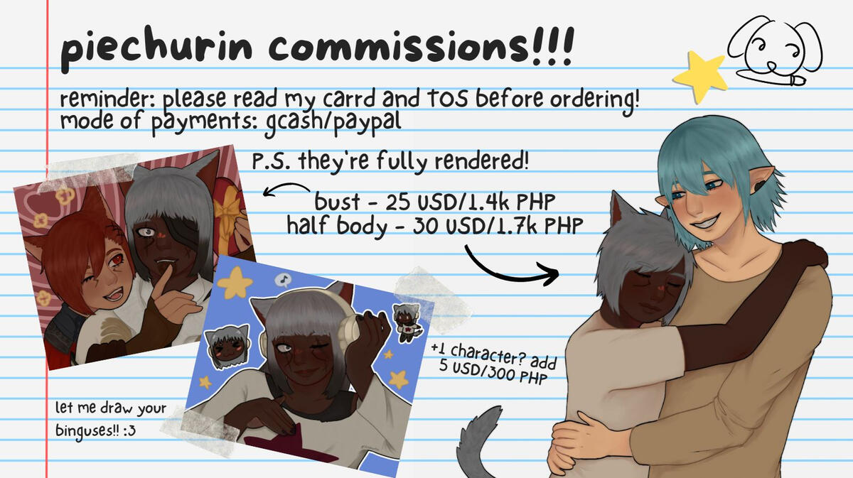 - Please DM me on Twitter if you're interested!- Once I have confirmed your slot, please pay the down-payment price (20% of the final work's price), and send me proof of payment.- After I have confirmed your down-payment, please send me the needed references and requests. You may let me know if there's any specific orientation/size you'd like to me use!- I will then make a rough sketch, which will need to be approved by you.- Once the sketch is approved, you may pay the rest of the price of the commission.- I will be sending updates for each stage. I may also post WIPS of the commission for my own content upkeep, but will let you know beforehand.- I will only do simple/colored backgrounds, but you may request for a minimal design (eg. scattered hearts, etc.). Should you wish for a detailed bacgkround, extra fees will apply depending on complexity.- Once the commission is finished, I'll send you the piece with and without background via email, and also have it placed in a google drive.- You may only refund during the sketch approval period. As for failure to comply with the commission (on my part), I will refund after my deadliest deadline has passed- provided I fail to provide any valid reasoning.